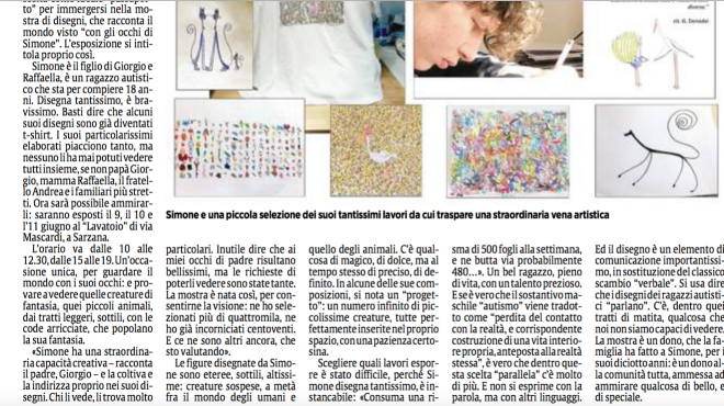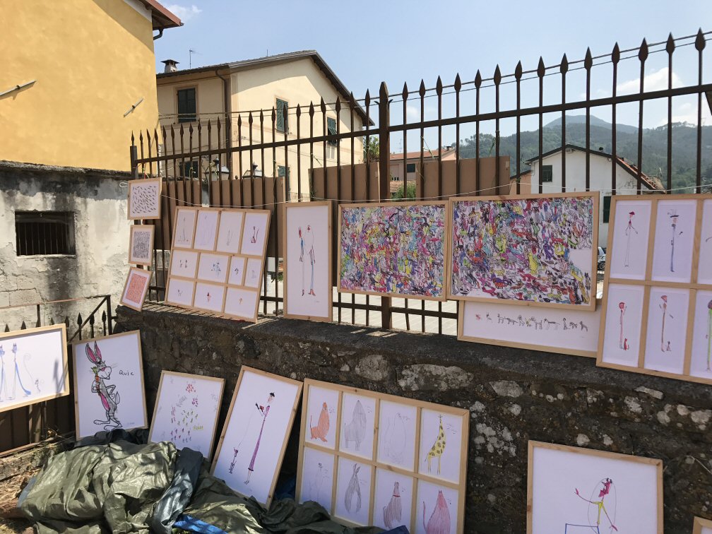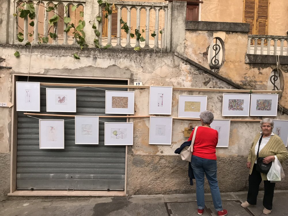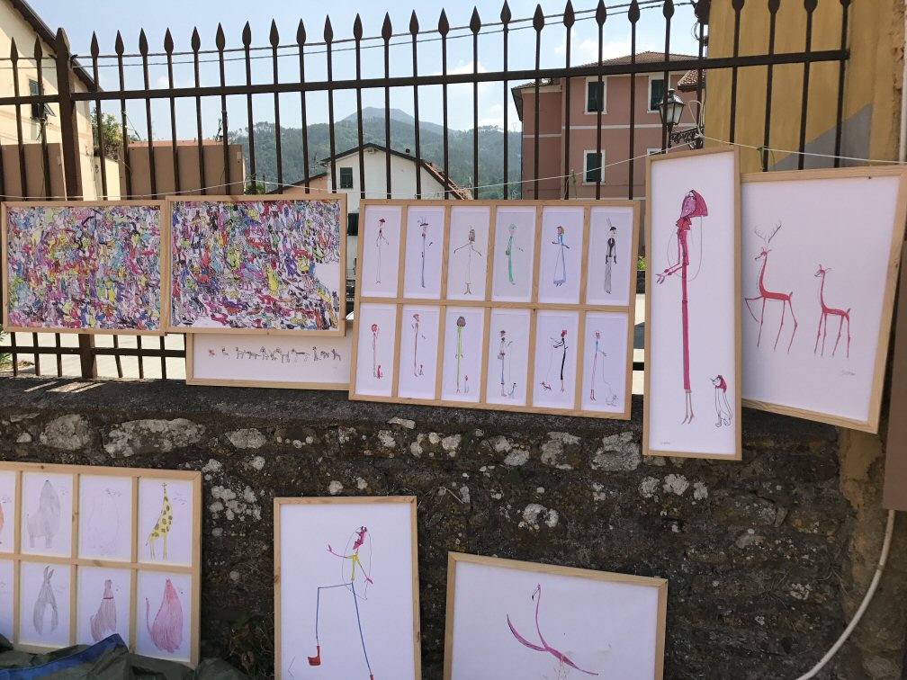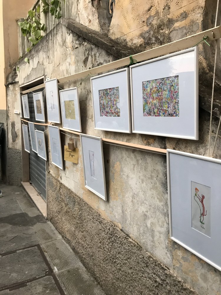 Noi abbiamo esposto una dozzina dei disegni più belli di Simone proprio nella piazzetta della Chiesa.
