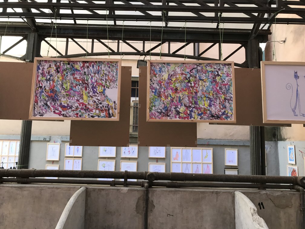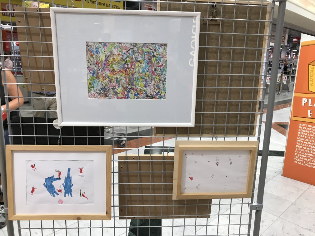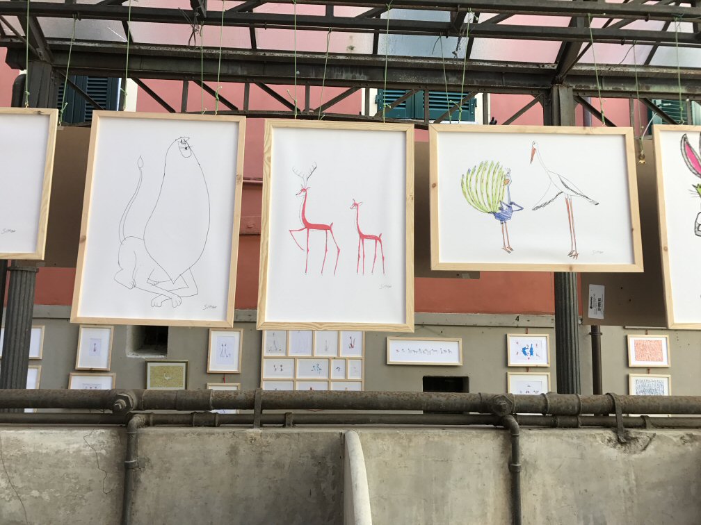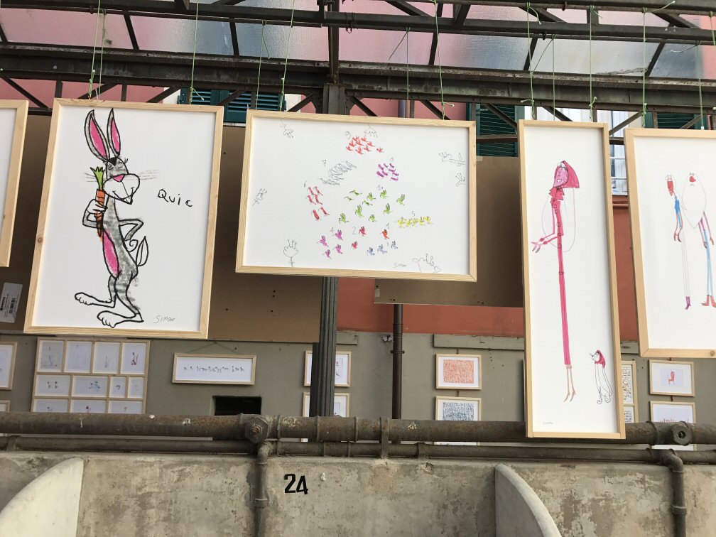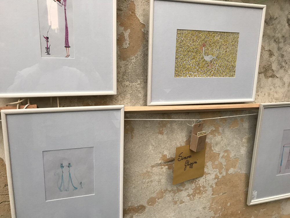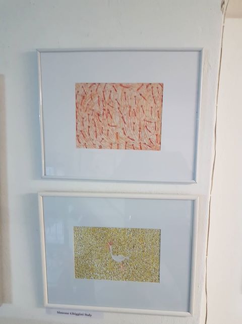 Abbiamo esposto, assieme a circa 25 artisti italiani e stranieri, due fra i disegni più belli di Simone: i pulcini e le scimmie rosse.