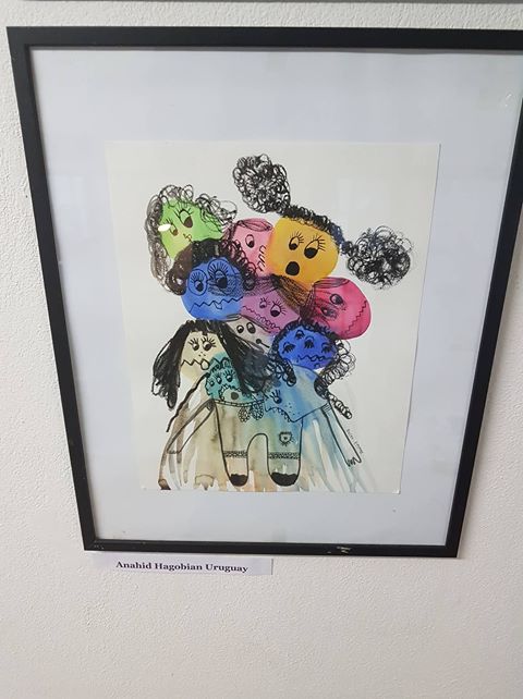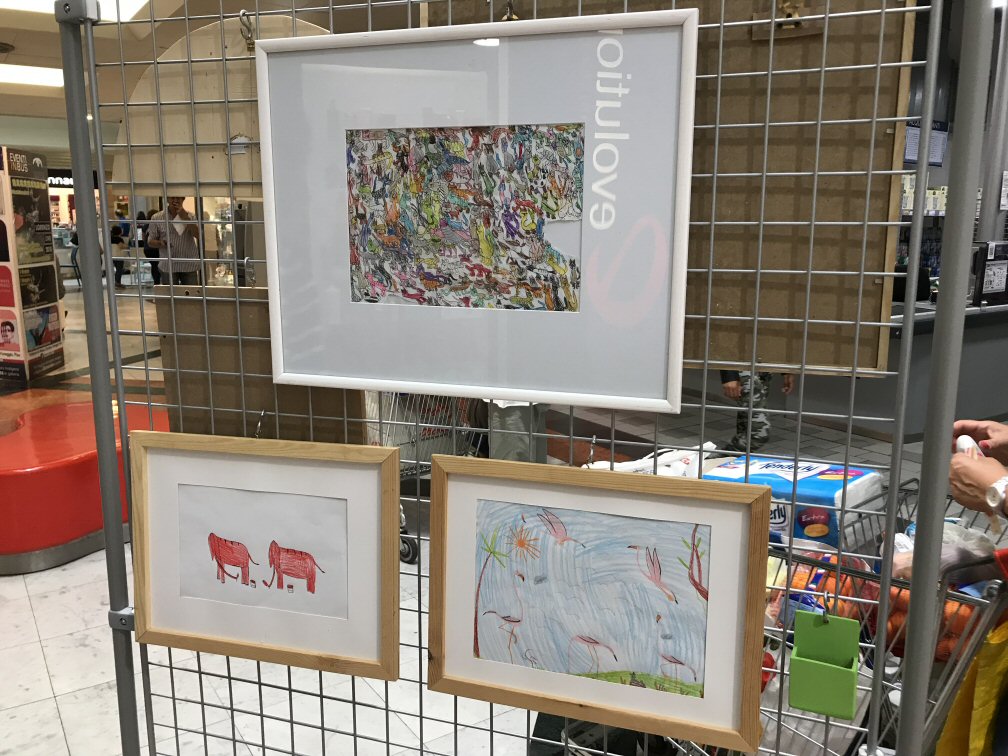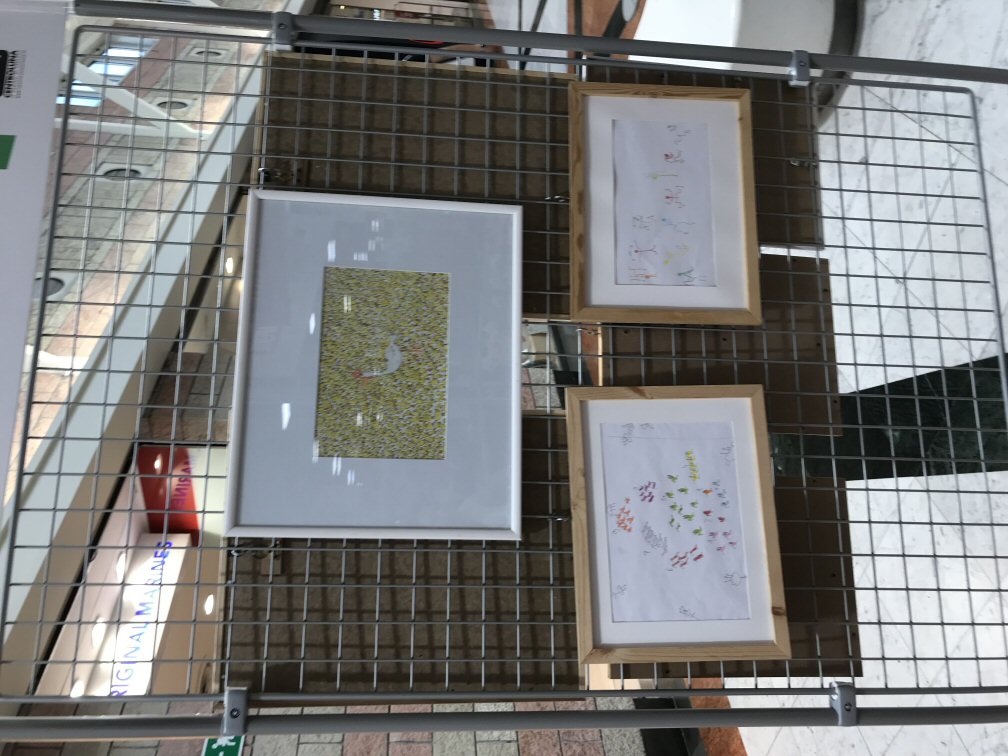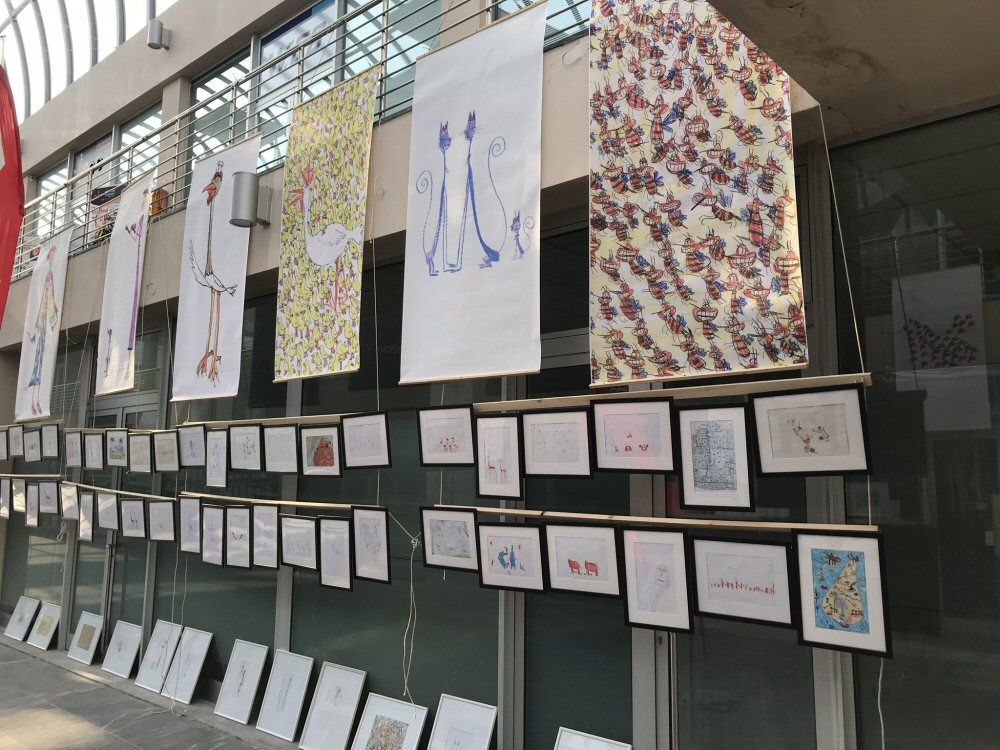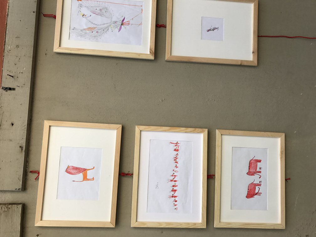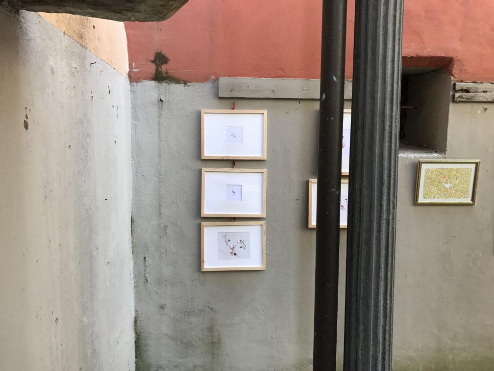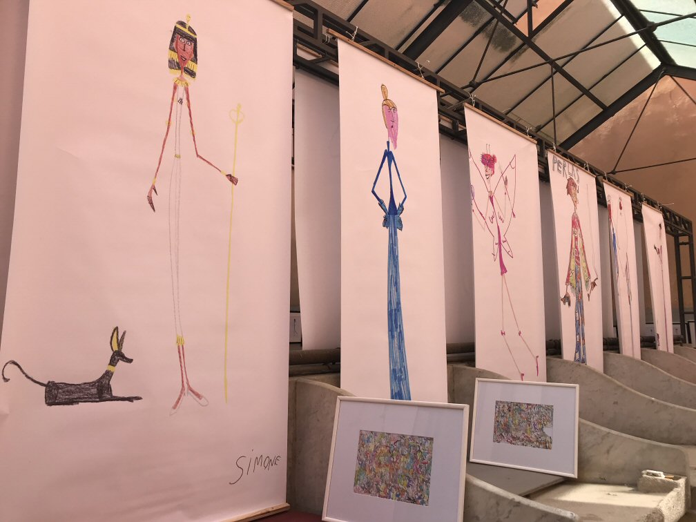 Abbiamo esposto, assieme a circa 25 artisti italiani e stranieri, due fra i disegni più belli di Simone: i pulcini e le scimmie rosse.