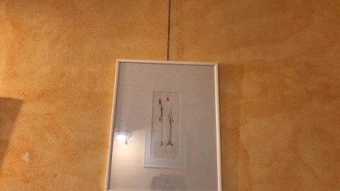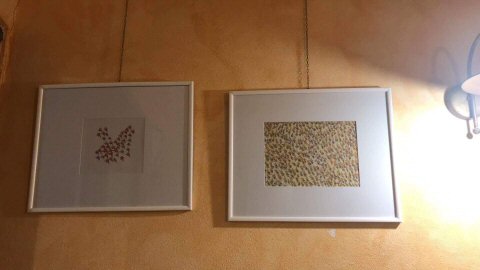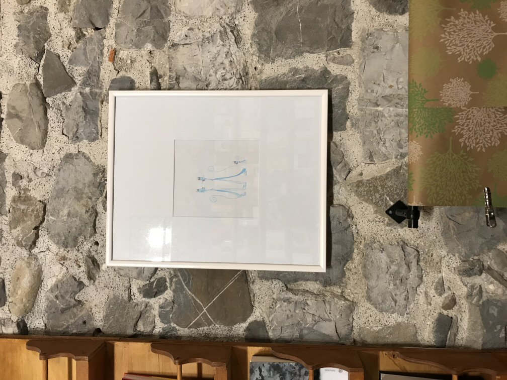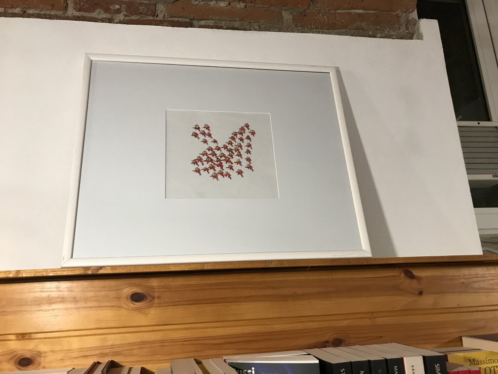 Le cornici, facciamo un giro e i prezzi sono alti, soprattutto visto il numero di disegni. Le cornici a giorno non mi piacciono, e allora opto per farmele da solo, non erano una bellezza ma ho risparmiato. Quasi tre mesi di serate passate a tagliare passpartout, montare cornicine attorno ai disegni, creare composizioni, ecc...divertente ma decisamente faticoso...ovviamente Simone non ha aiutato...lui fa l'artista.
